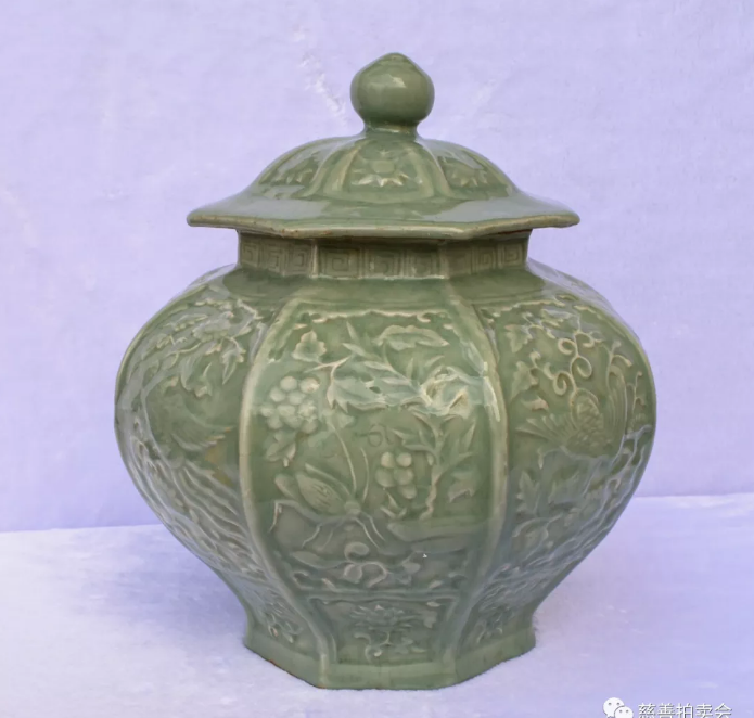 線上支付10.13煙臺--58號拍品 元龍泉窯青釉刻花鳥蟲紋八方蓋罐