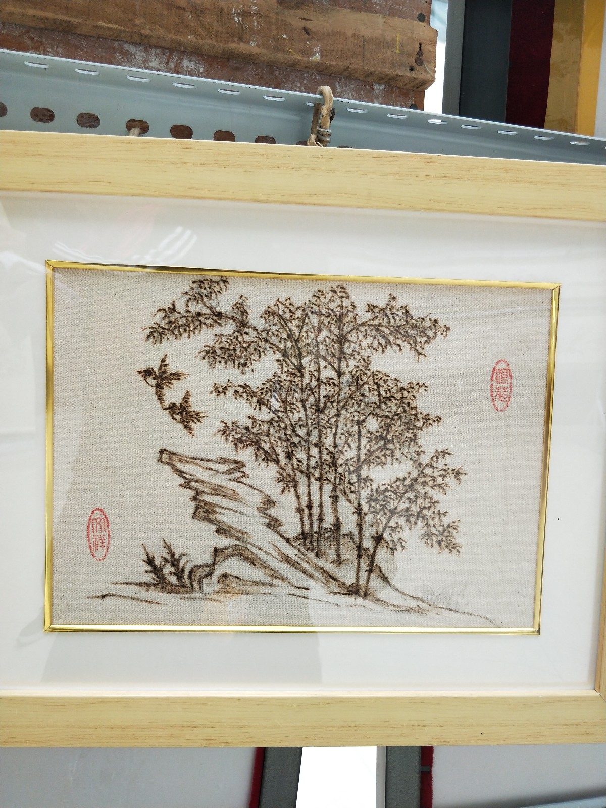 慈善布烙燙畫作品《梅蘭竹菊》 規格:0.32m*0.4m (共4幅)