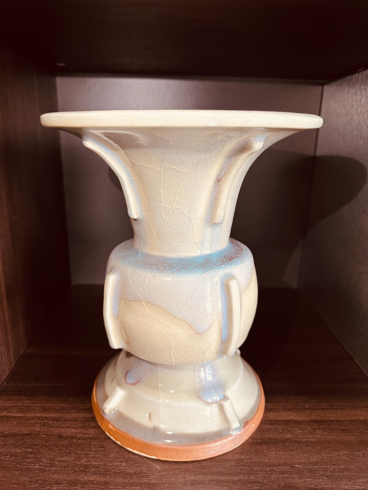 鈞瓷始于唐、盛于宋,是中國古代五大名瓷之一,并以其獨特的釉料及燒成方法產生的窯變神奇而聞名于世。 瓷作為中國陶瓷藝術史上的一個重要符號,在世界陶瓷發展史上占有重要地位。自古就有“黃金有價鈞無價”、“家有萬貫,不如鈞瓷一片”之說。它獨特的窯變藝術,以其“入窯一色,出窯萬彩“的藝術特點。尊的造型仿古代青銅器式樣,喇叭形口,扁鼓形腹,圈足外撇。頸、腹、足之四面均塑貼條形方棱,俗稱“出戟”。通體施月白色釉,釉內氣泡密集,釉面有棕眼。器身邊棱處因高溫燒成時釉層熔融垂流,致使釉層變薄,映現出胎骨呈黃褐色。此尊風格古樸、大氣,為宋代宮廷使用的典型陳設用瓷。