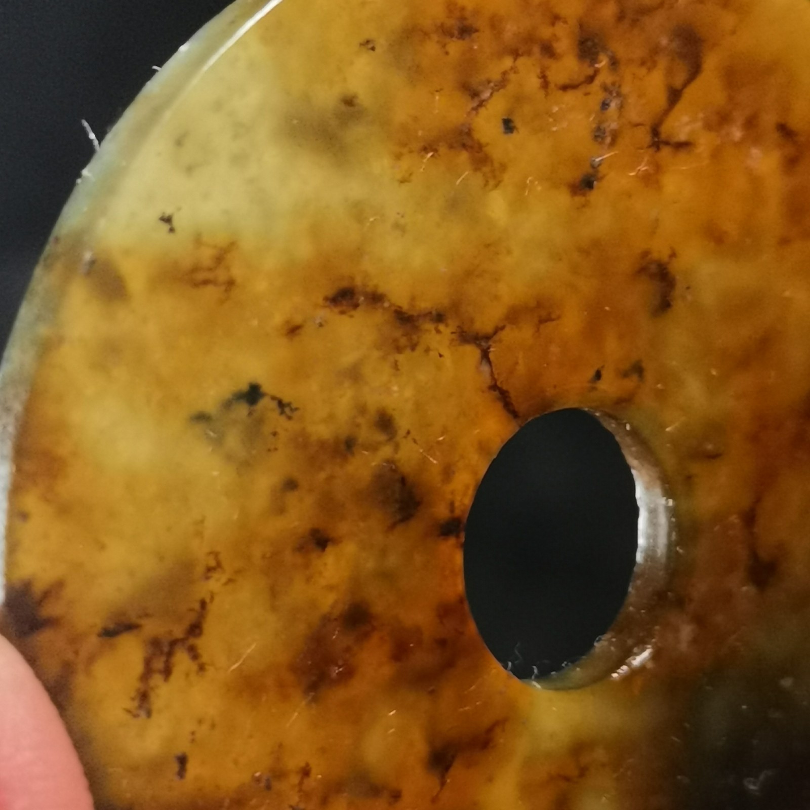 舊藏老玉壁,規格直徑6.5cm,厚度0.3cm,重23g。老玉壁,集老玉的特征