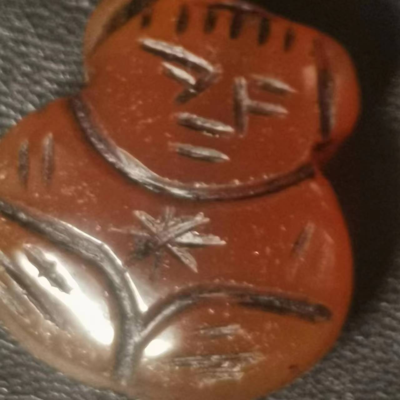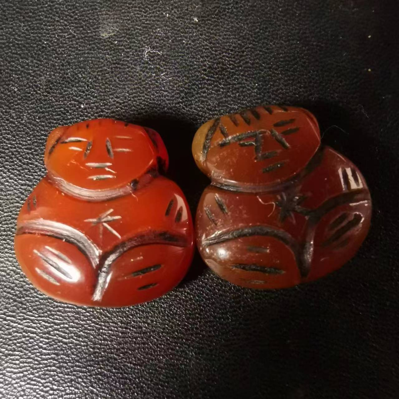 舊藏戰(zhàn)國紅瑪瑙童子一對,規(guī)格0.8×2×2cm,重10.9g。明代雕刻工,雙面雕刻件。