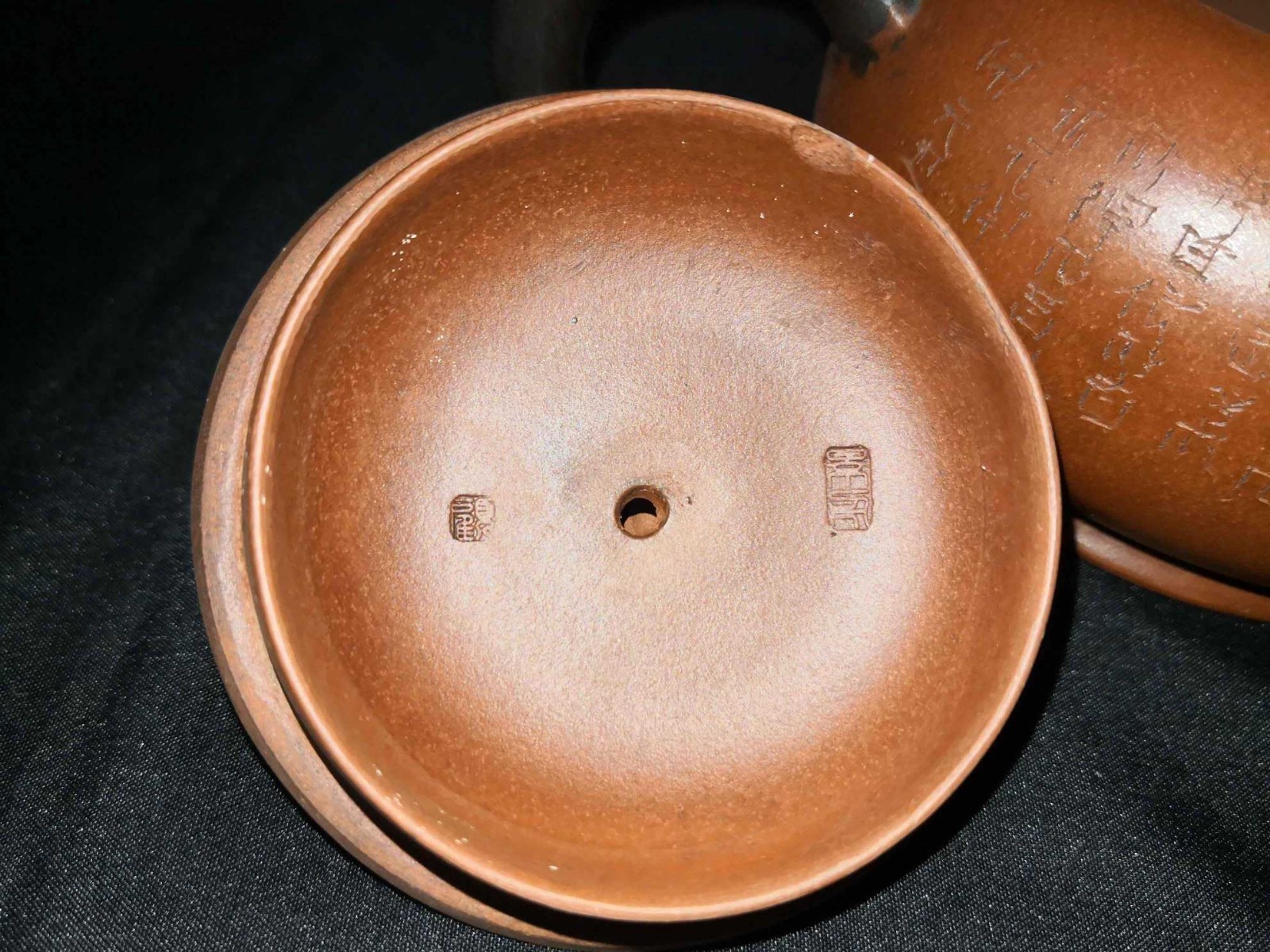 顧景舟款圈鈕刻字紫砂壺、徐麗英款魚化龍紫砂壺、顧景舟款竹刻石
