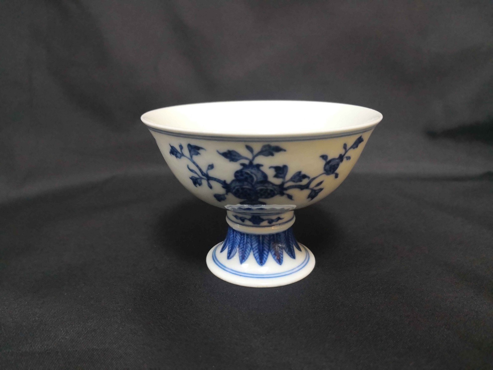 【描述】此高足杯敞口外撇,深斜腹,底承高足。拍品做工精湛,紋飾繁縟,通體施白釉,外壁以青花繪纏枝蓮紋,底部繪變形蓮瓣紋;內壁光素瑩潔,高足內壁署青花「大清乾隆年制」六字篆書橫款。整器小巧精湛,造型秀美,胎體潔白堅致,釉色瑩潤喜人,值得典藏。