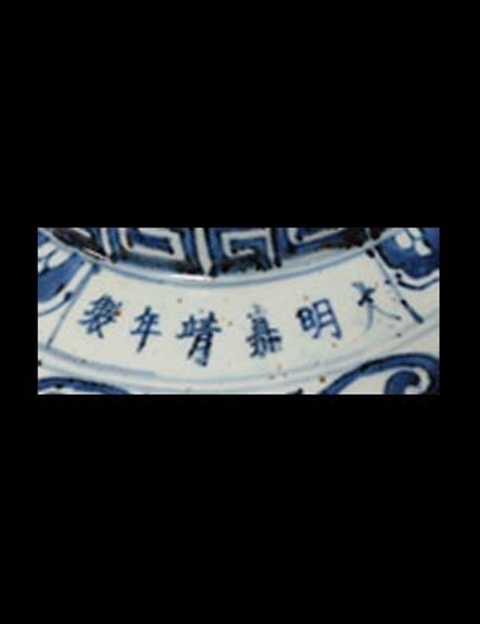 【描述】此罐直口,短頸,豐肩,鼓腹,腹下漸收,近足處外撇,足邊斜削,淺寬圈足。通體青花裝飾,腹通人物故事紋飾,近足處繪海水江崖紋。青花發色濃重偏灰,釉面泛青,肩部以青料書“大明嘉靖年制”款識。